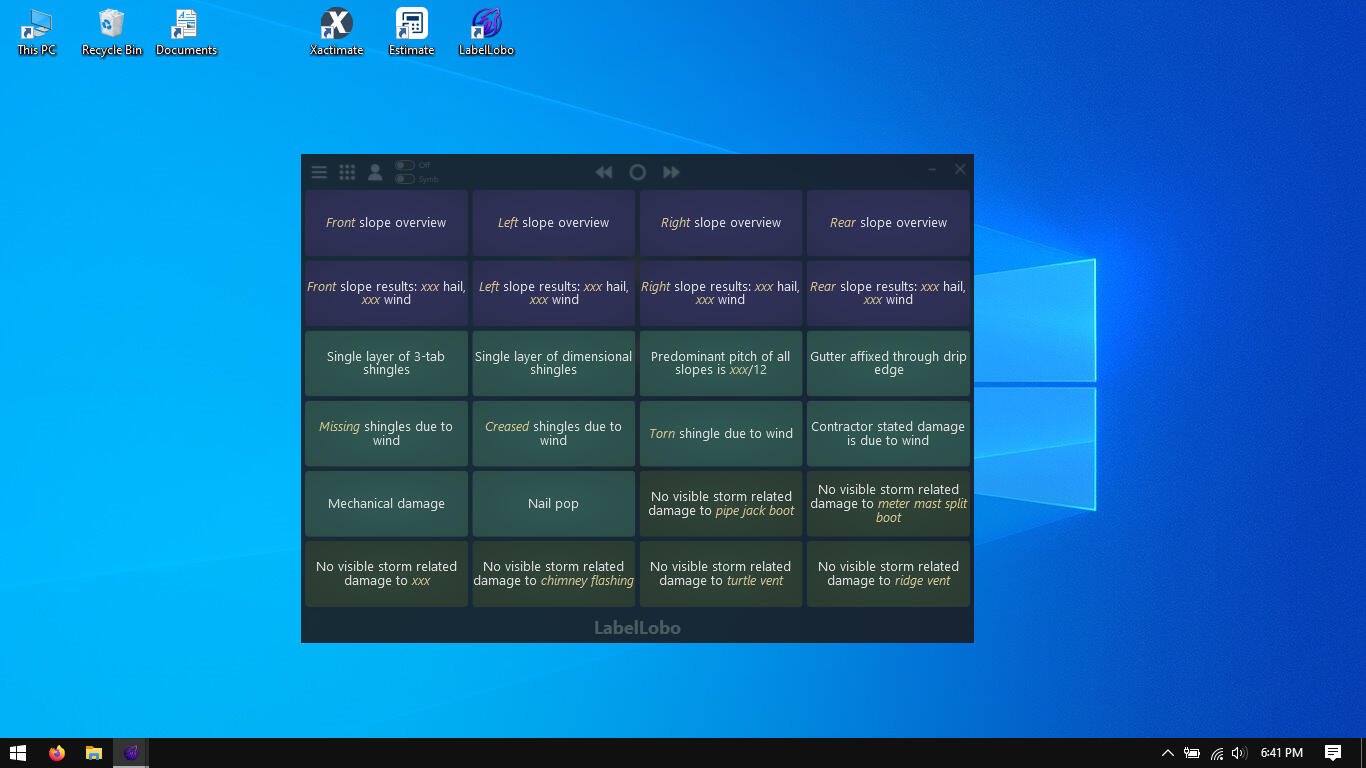 LabelLobo's aim is to save you many combined hours at the desk or on deployment by eliminating the need for relentless and repetitive typing of the same phrases and photo descriptions with its completely customizable workspace. Simply press a user-defined phrase button and LabelLobo automatically labels the photo. As an independent adjuster, I truly believe LabelLobo stands up against any other photo labeling tool available--even in the age of AI.
